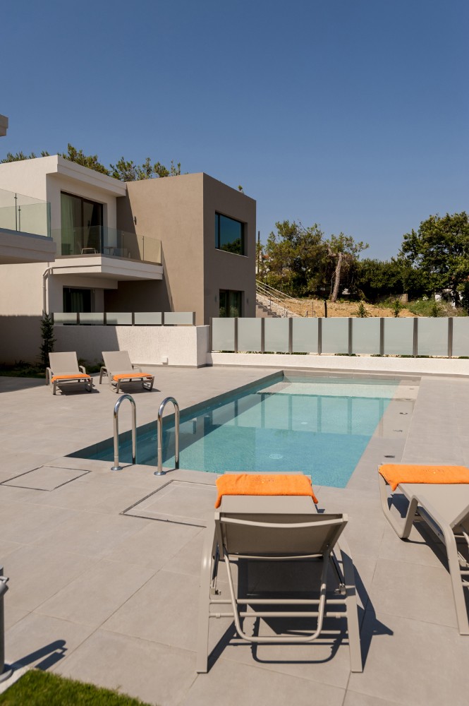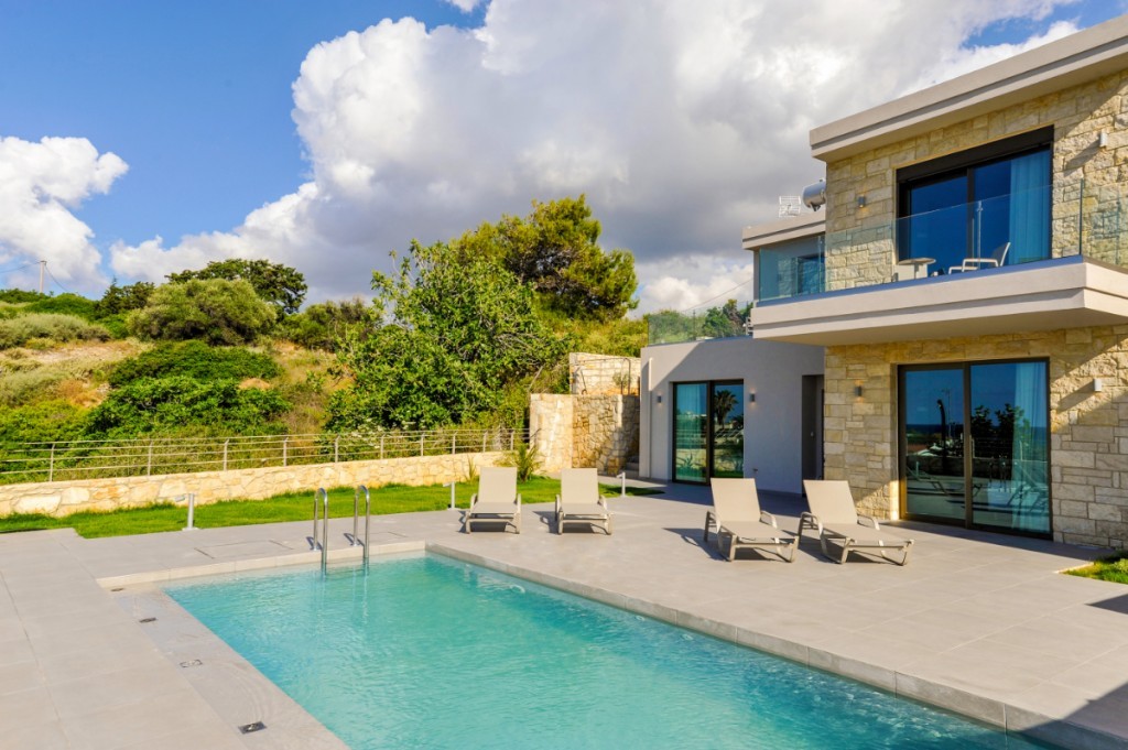 Villa Aiolos is unfolding in 2 levels, on the 1st floor there is the spacious and fully equipped kitchen bathed in the light coming in from the balcony door of the huge veranda overlooking the endless blue and the large courtyard with the pool.