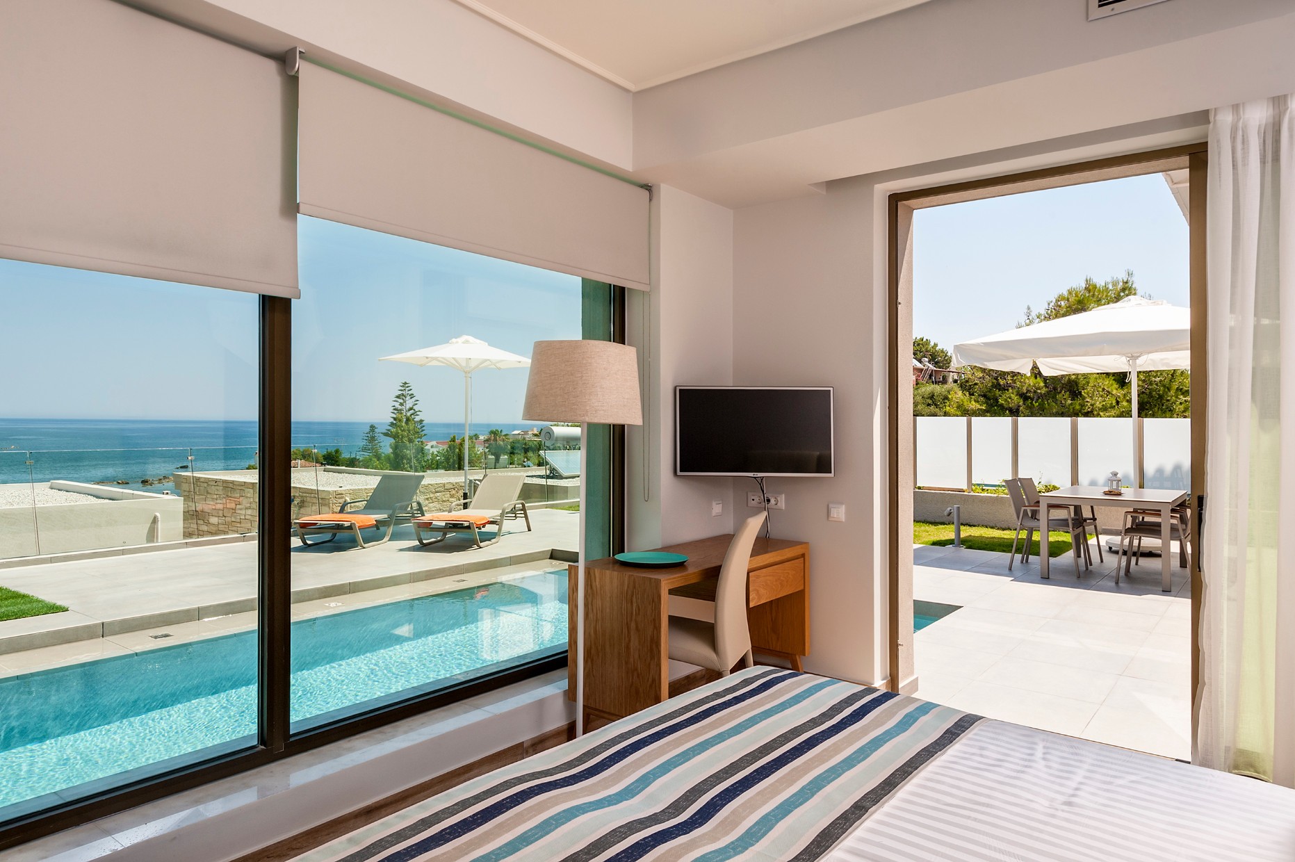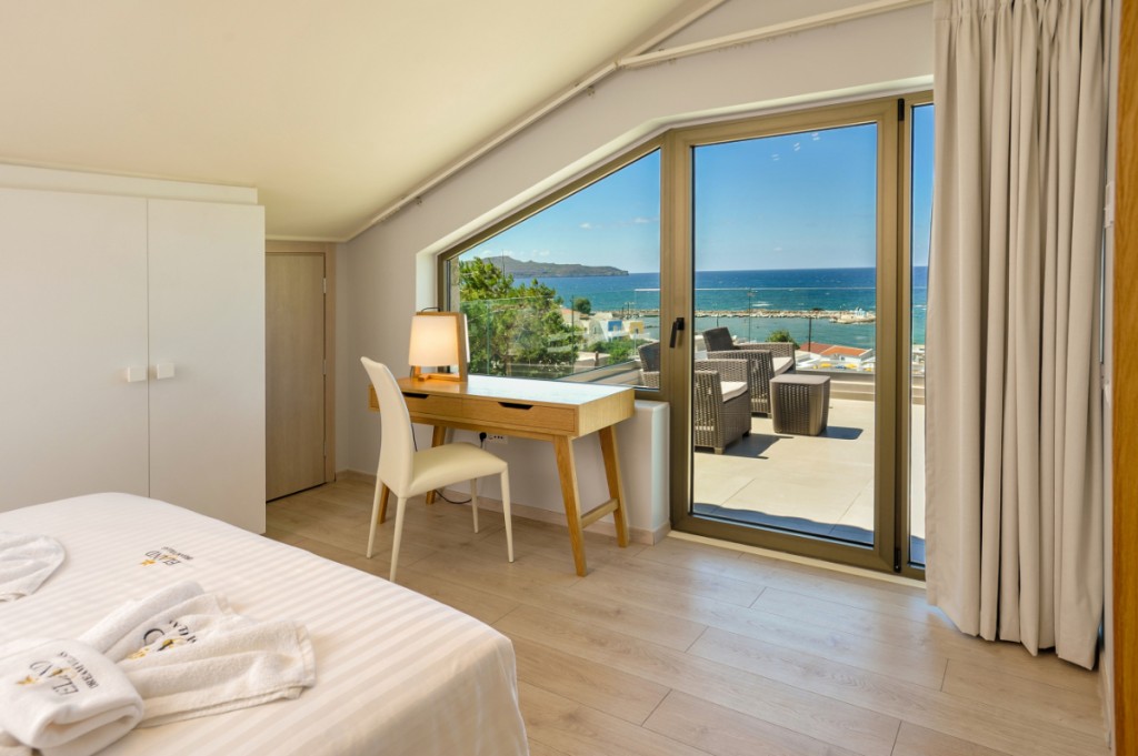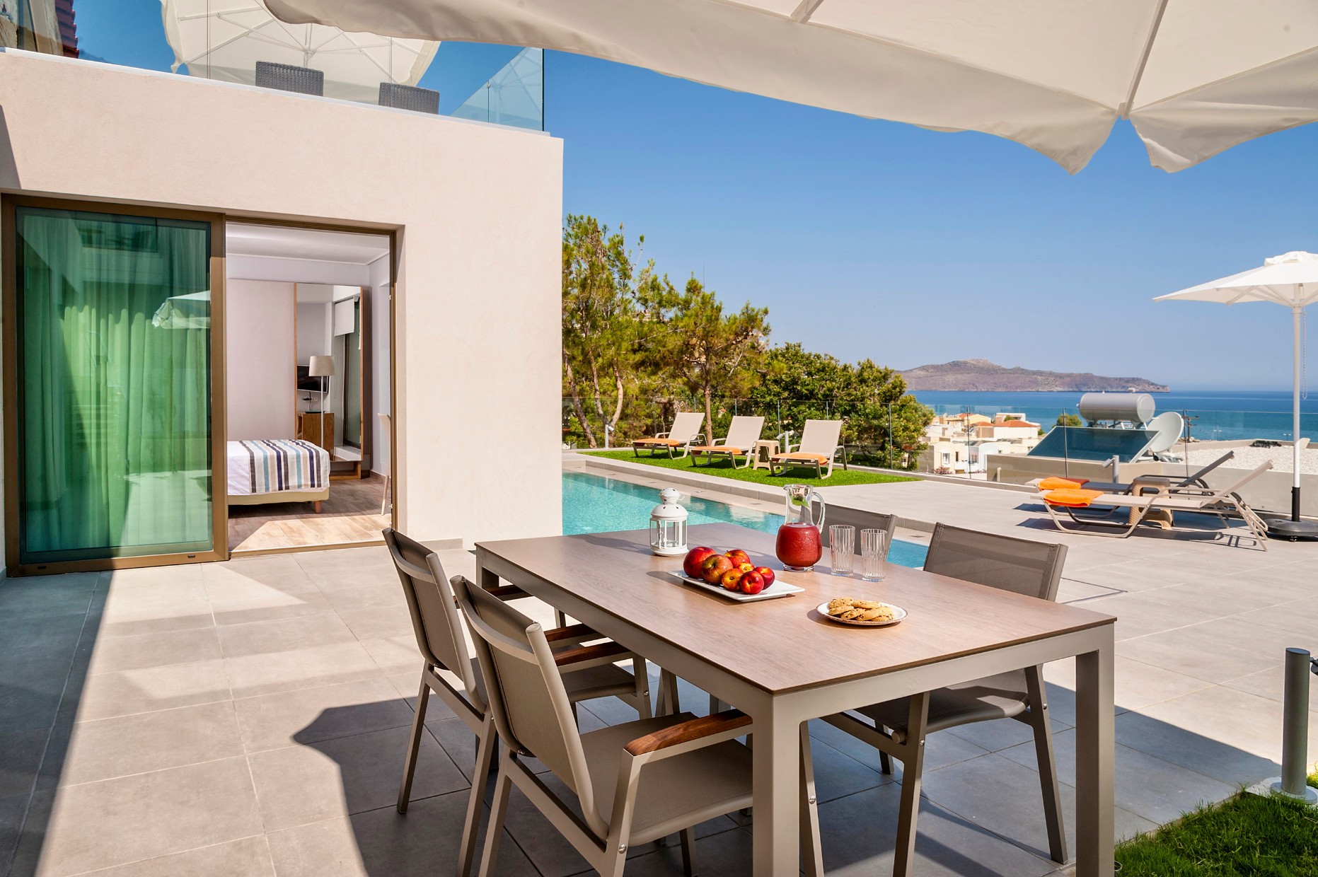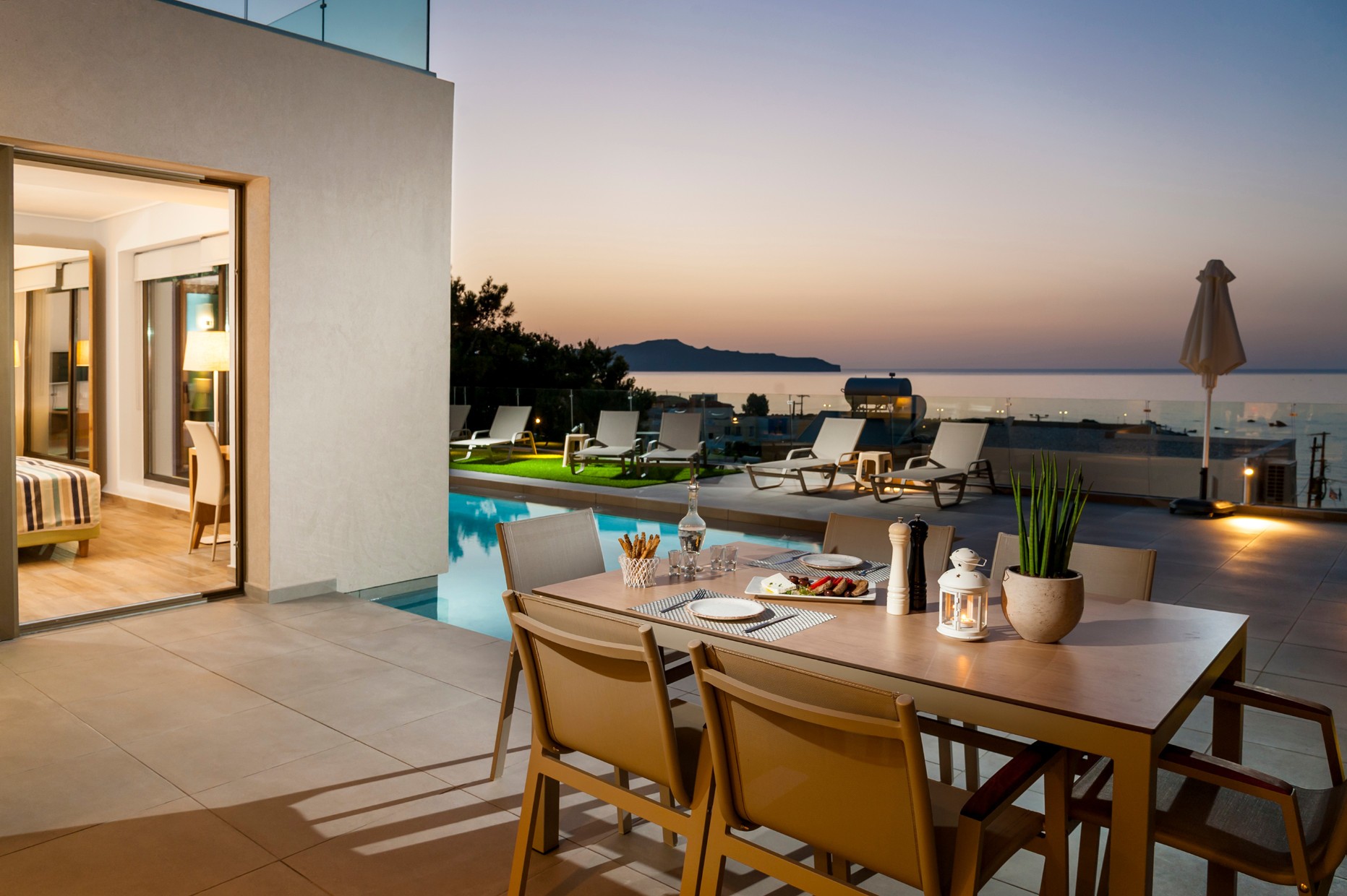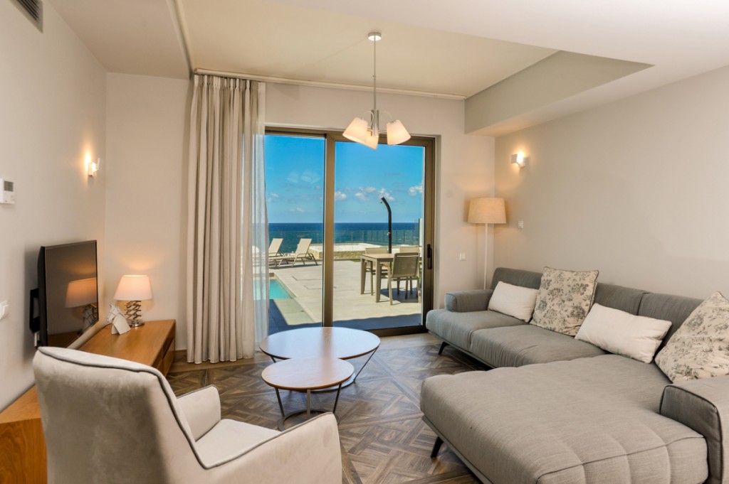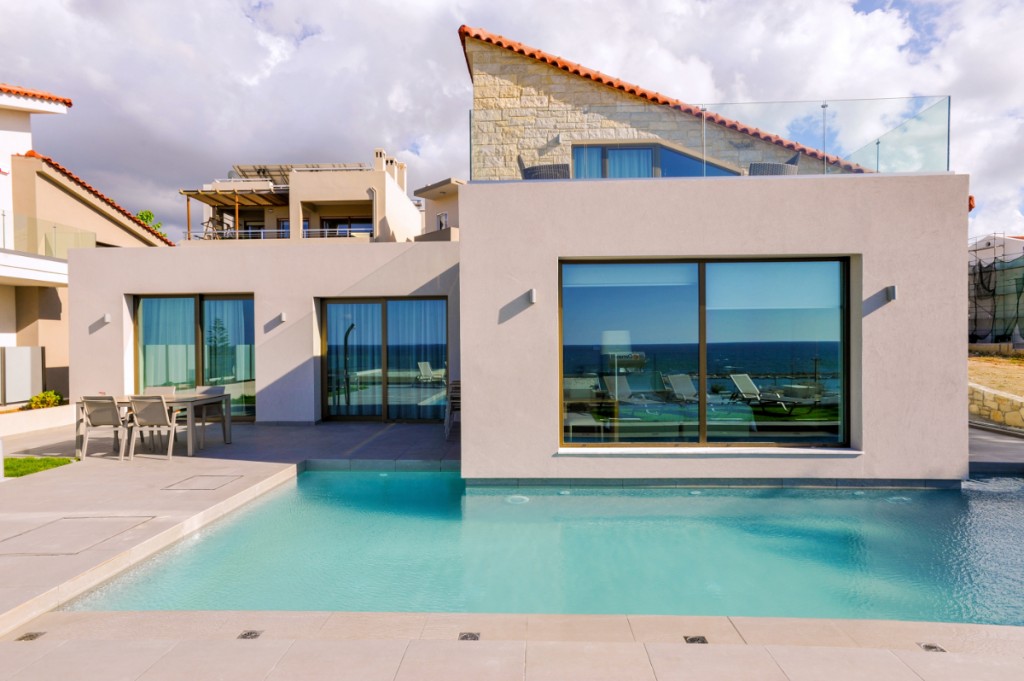 The ground floor consists of a spacious open-plan living room and kitchen which is equipped with modern electrical appliances and cookware of excellent quality. On the same level are 3 bedrooms all with en suite bathrooms and sea views. On the first floor there is another bedroom with an en suite bathroom. This bedroom boasts the largest veranda of the villa with a stunning sea view.