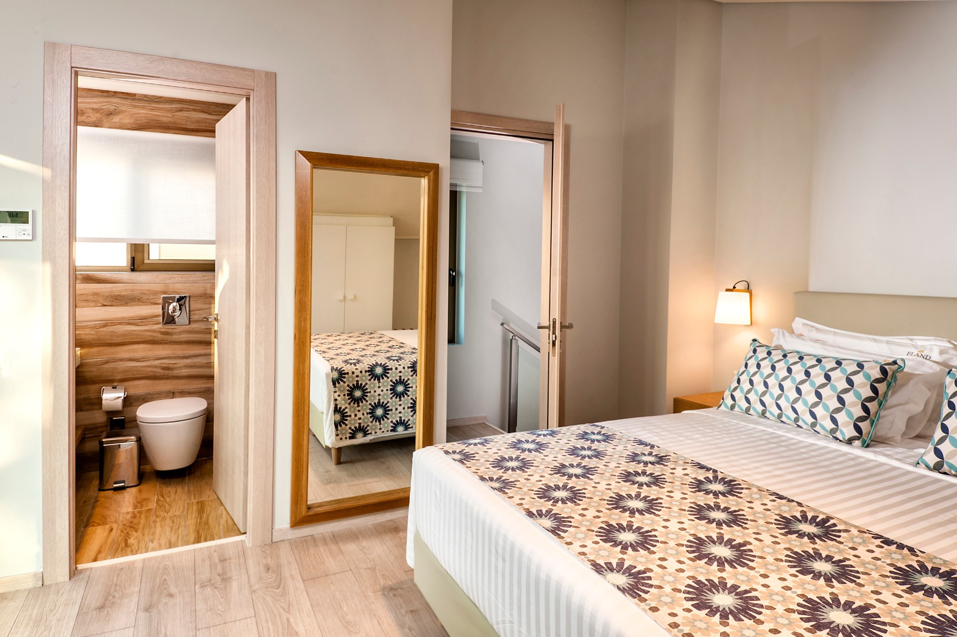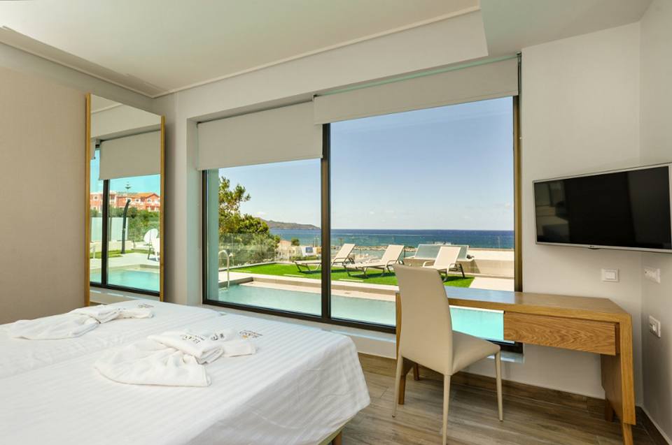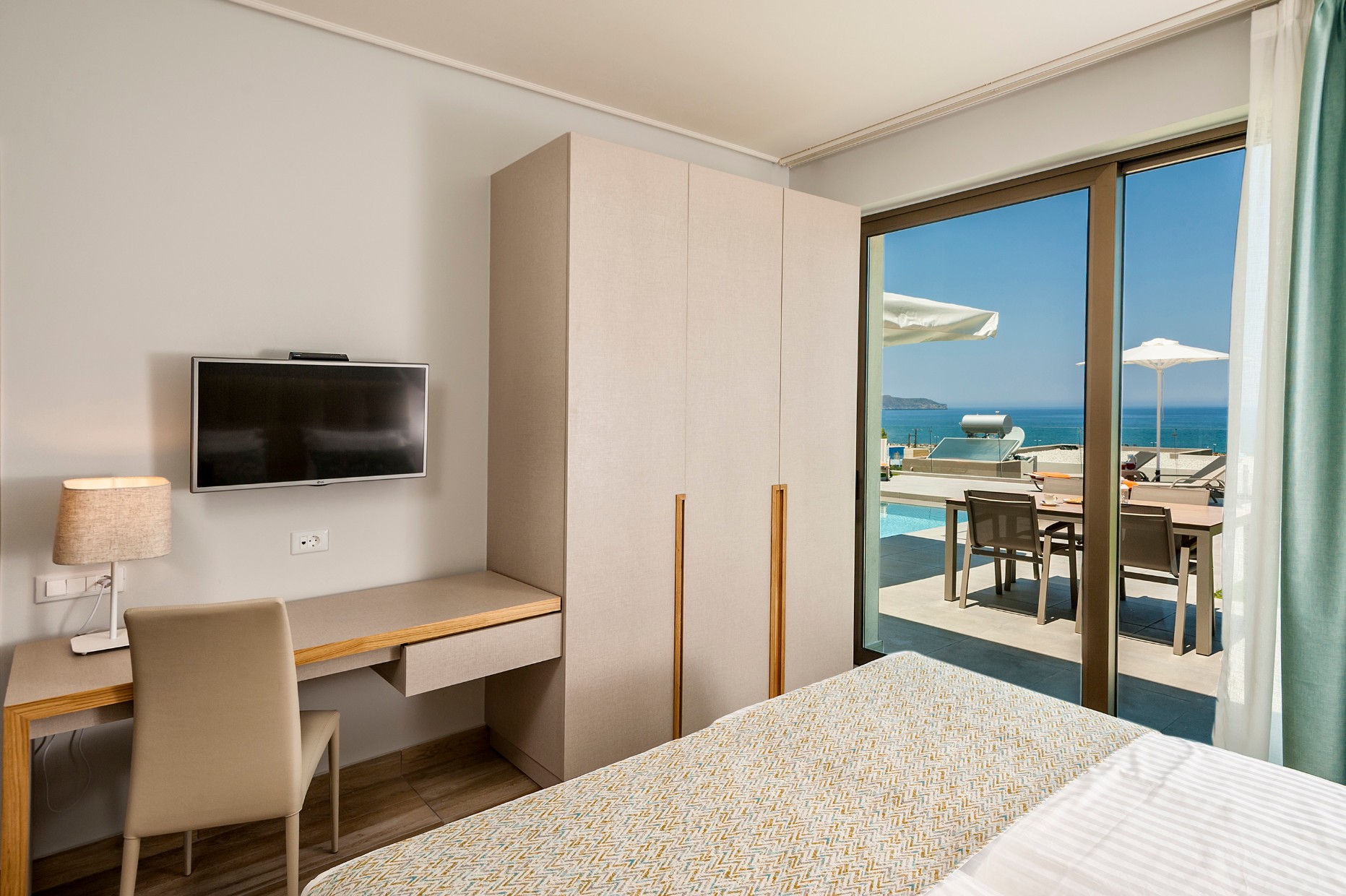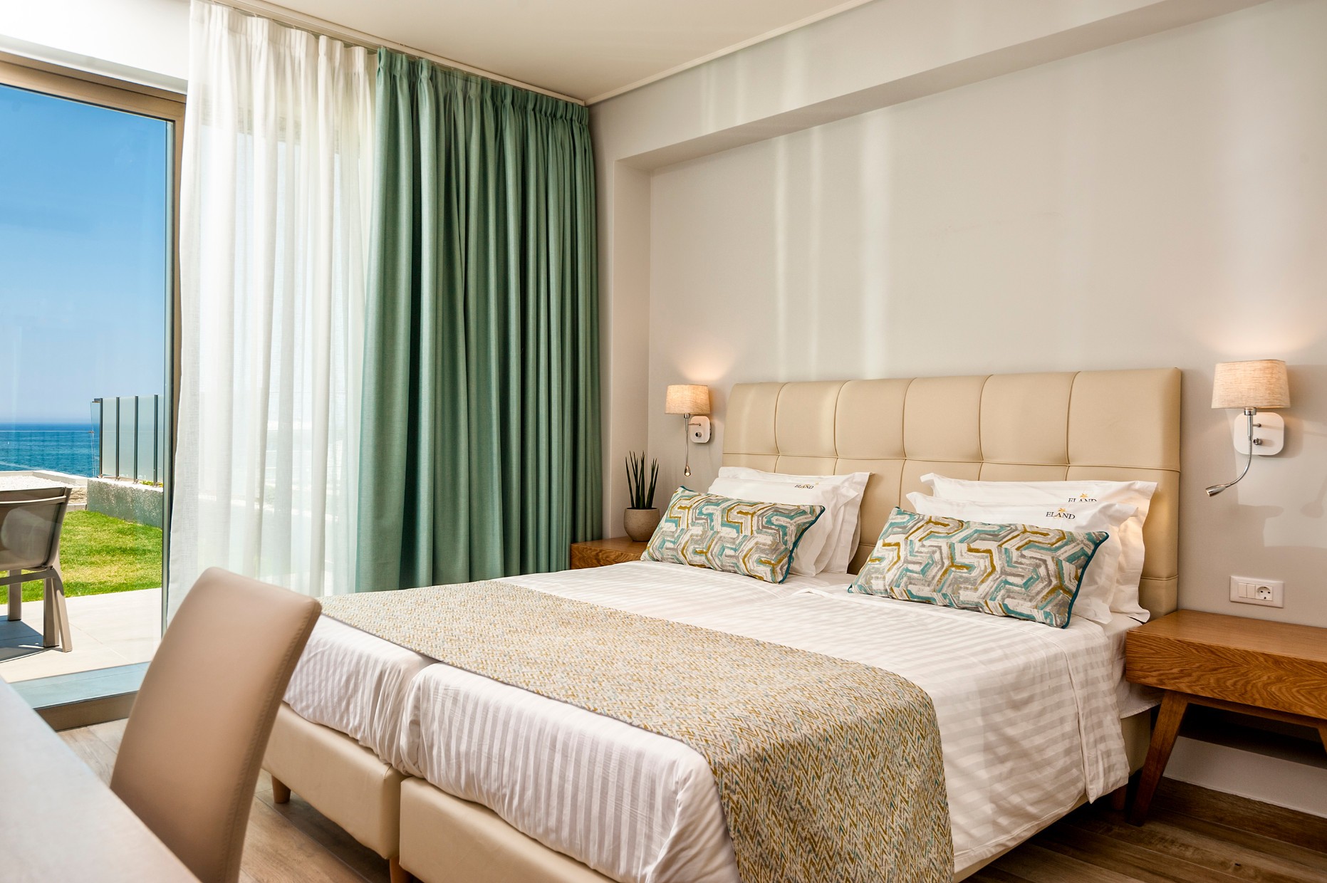 The ground floor consists of a spacious open-plan living room and kitchen which is equipped with modern electrical appliances and cookware of excellent quality. On the same level are 3 bedrooms all with en suite bathrooms and sea views. On the first floor there is another bedroom with an en suite bathroom. This bedroom boasts the largest veranda of the villa with a stunning sea view.