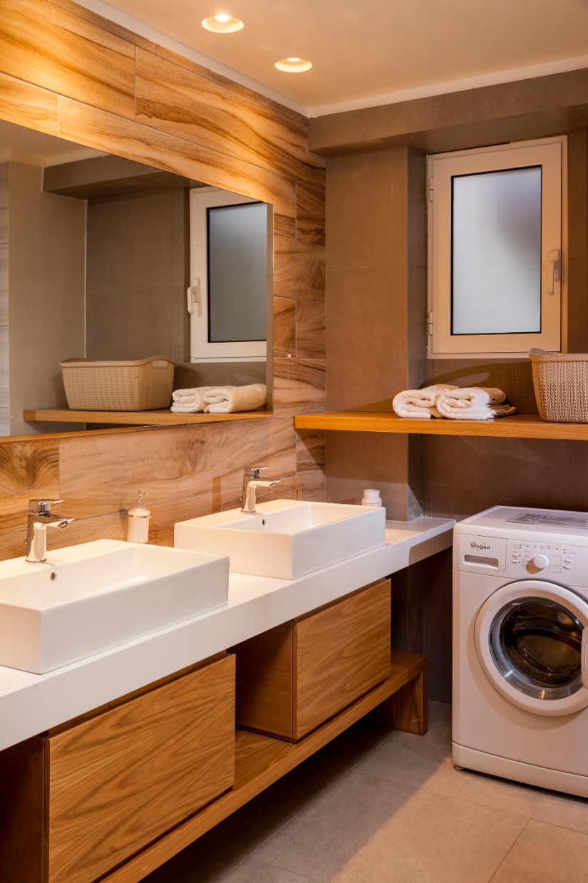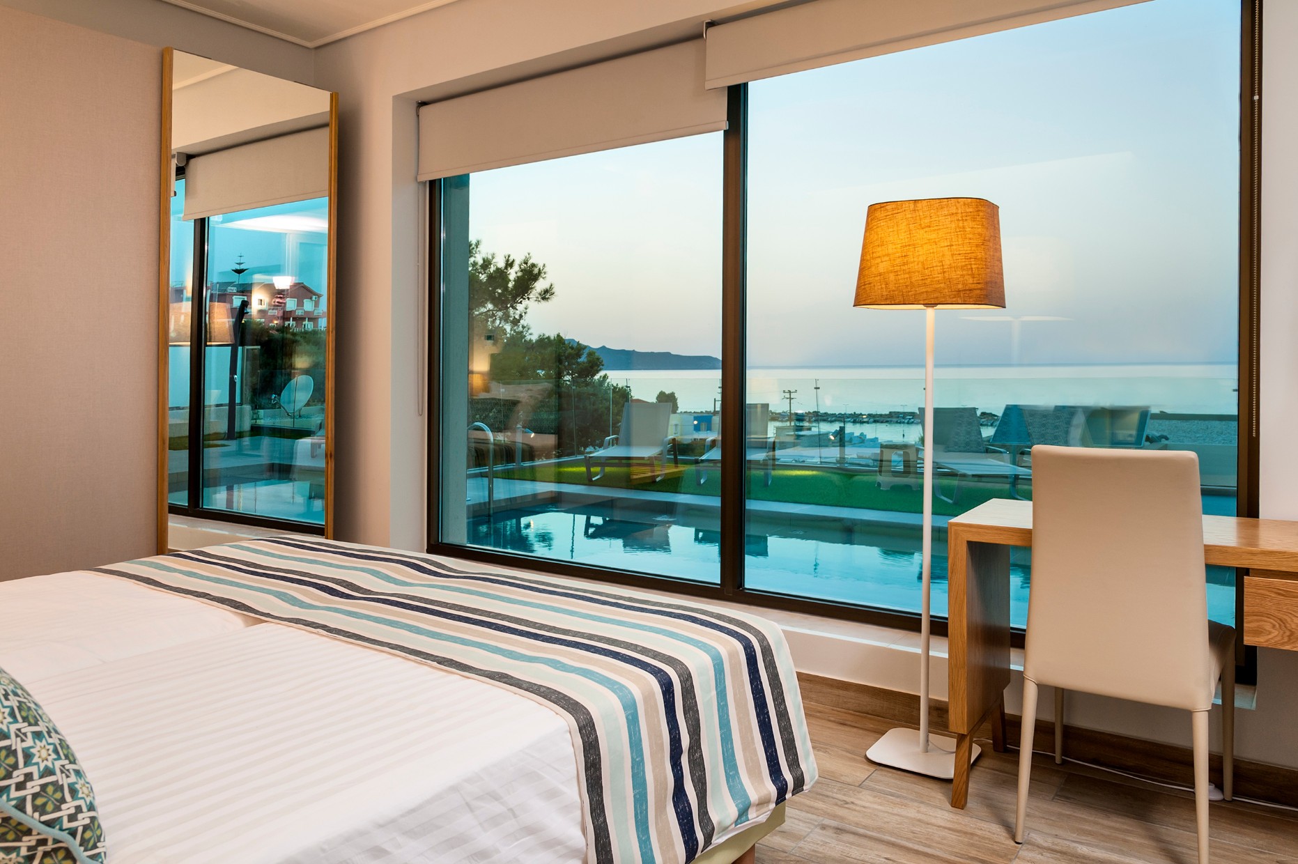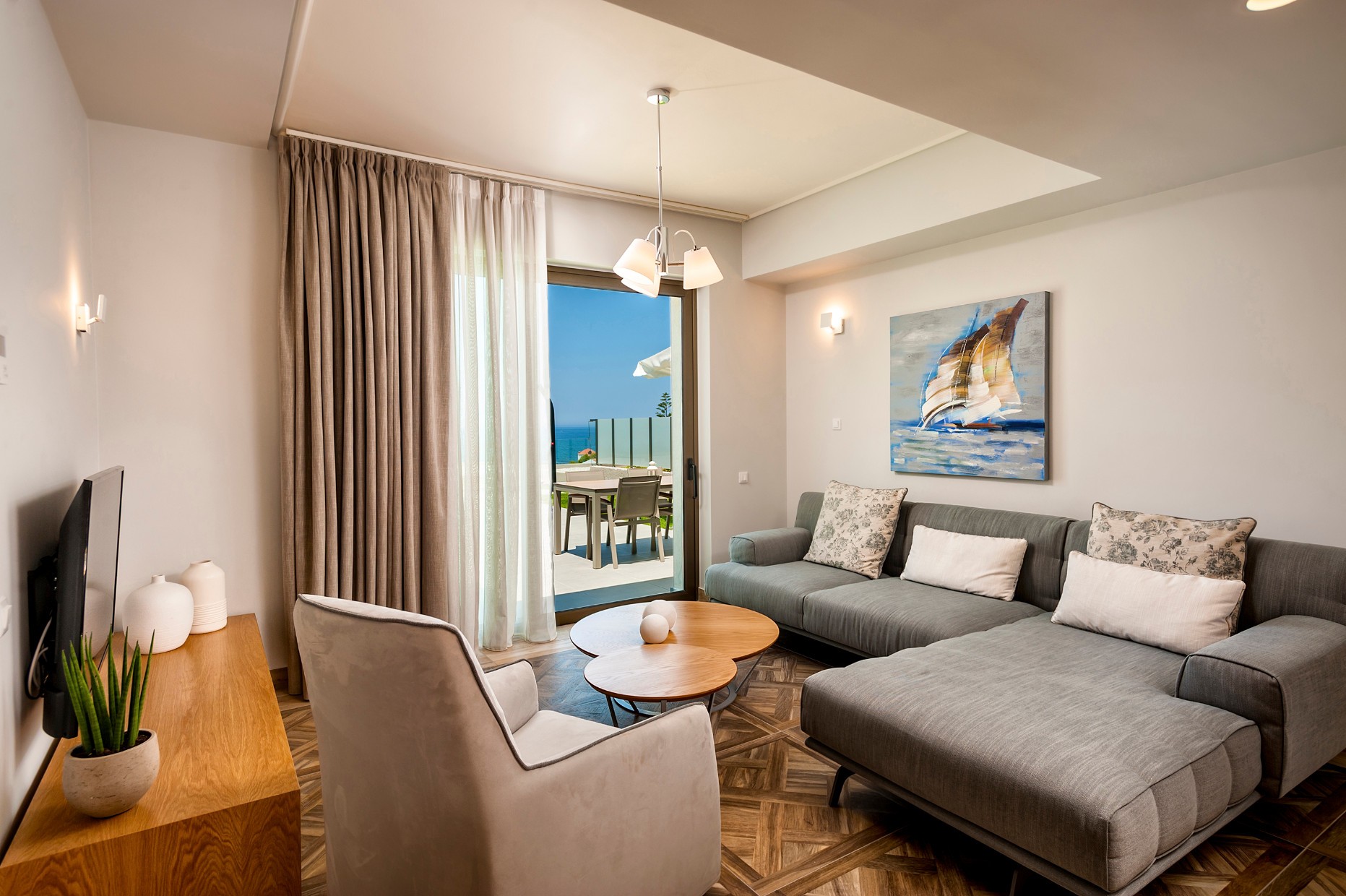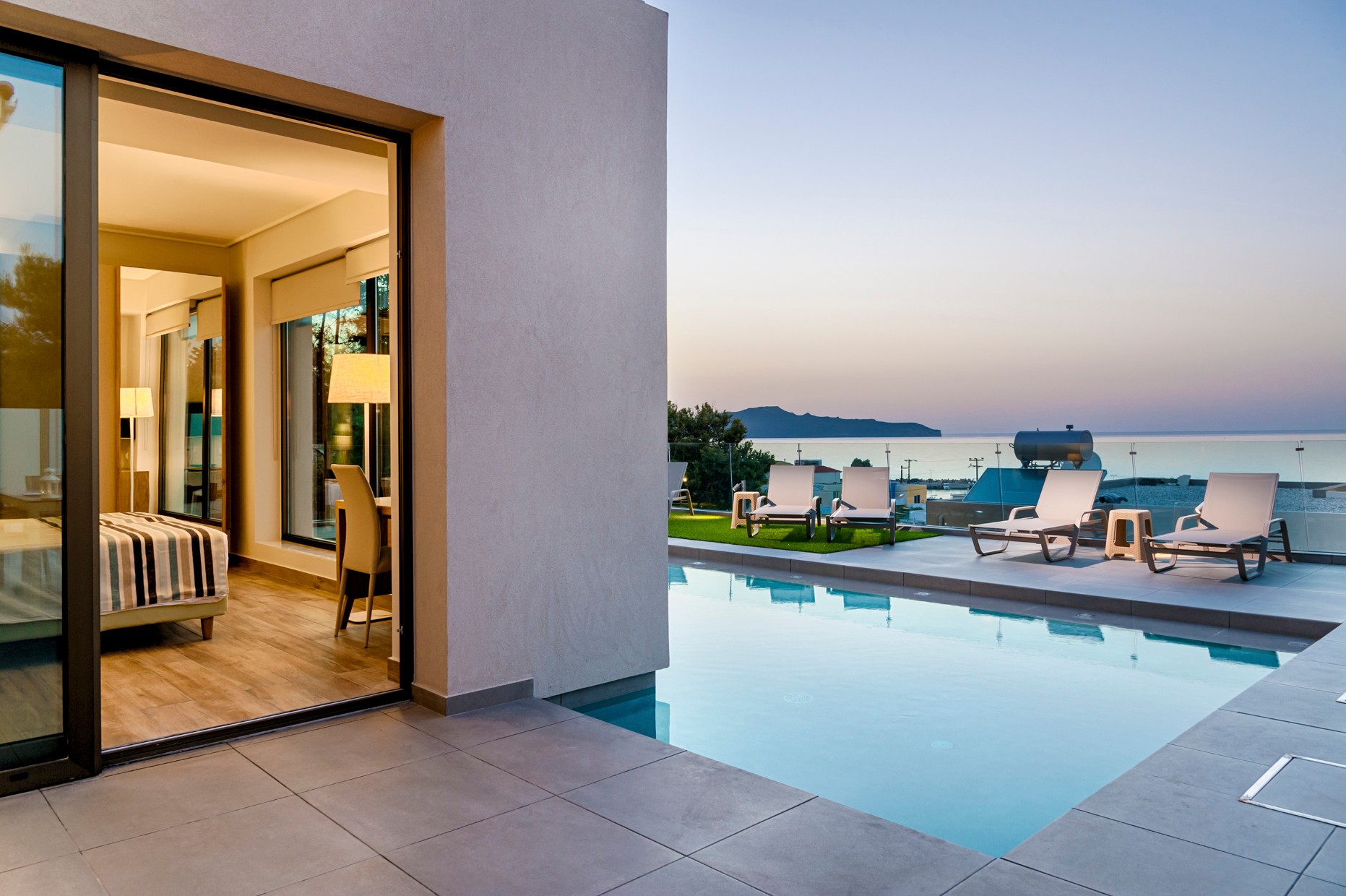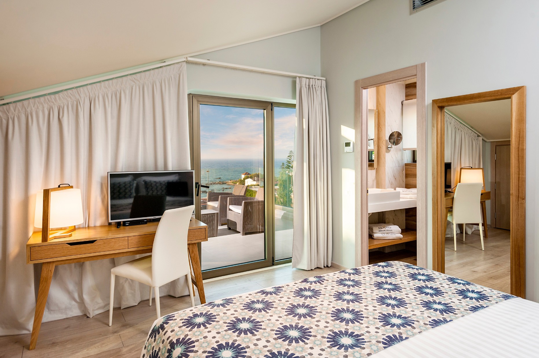 The ground floor consists of a spacious open-plan living room and kitchen which is equipped with modern electrical appliances and cookware of excellent quality. On the same level are 3 bedrooms all with en suite bathrooms and sea views. On the first floor there is another bedroom with an en suite bathroom. This bedroom boasts the largest veranda of the villa with a stunning sea view.