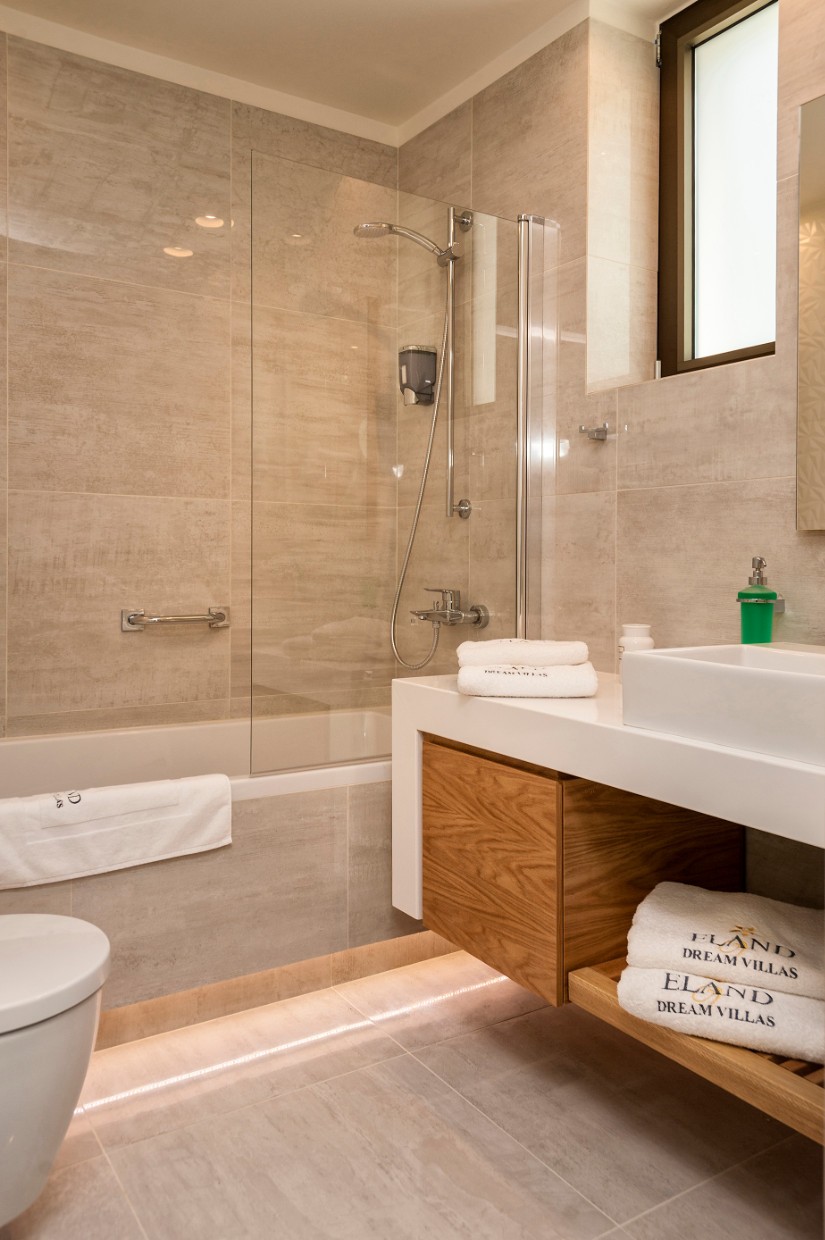 An additional bedroom is located beneath the villa benefitting from natural sunlight and an en suite bathroom. It also has a small seating area. Located next door to the bedroom is an air-conditioned family room.